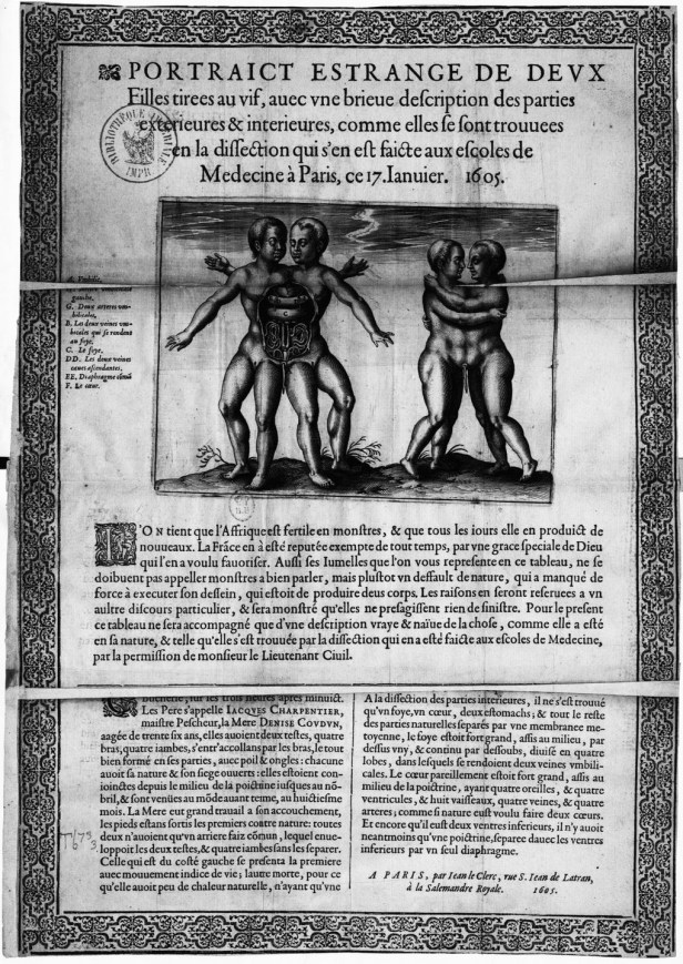 publicidad Siamesas en el siglo XVII Fecha: 20 marzo, 2017Autor/a: pulchrum museum 0 Comentarios «Portraict estrange de deux filles tirées au vif…», cartel, Francia?, 1605. Disponible en: Gallica Compartir: Compartir en X (Se abre en una ventana nueva) X Compartir en Facebook (Se abre en una ventana nueva) Facebook Compartir en Tumblr (Se abre en una ventana nueva) Tumblr Share on Pinterest (Se abre en una ventana nueva) Pinterest Compartir en WhatsApp (Se abre en una ventana nueva) WhatsApp Email a link to a friend (Se abre en una ventana nueva) Correo electrónico Me gusta Cargando...