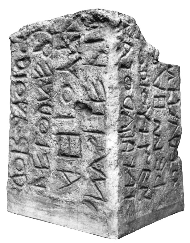 En esta oscura piedra se encuentra tallado uno de los más antiguos testimonios de escritura latina. Se trata de una escritura mayúscula en bustrófedon, relacionada con la escritura etrusca y el griego arcaico. Disponible en: Ohio Link