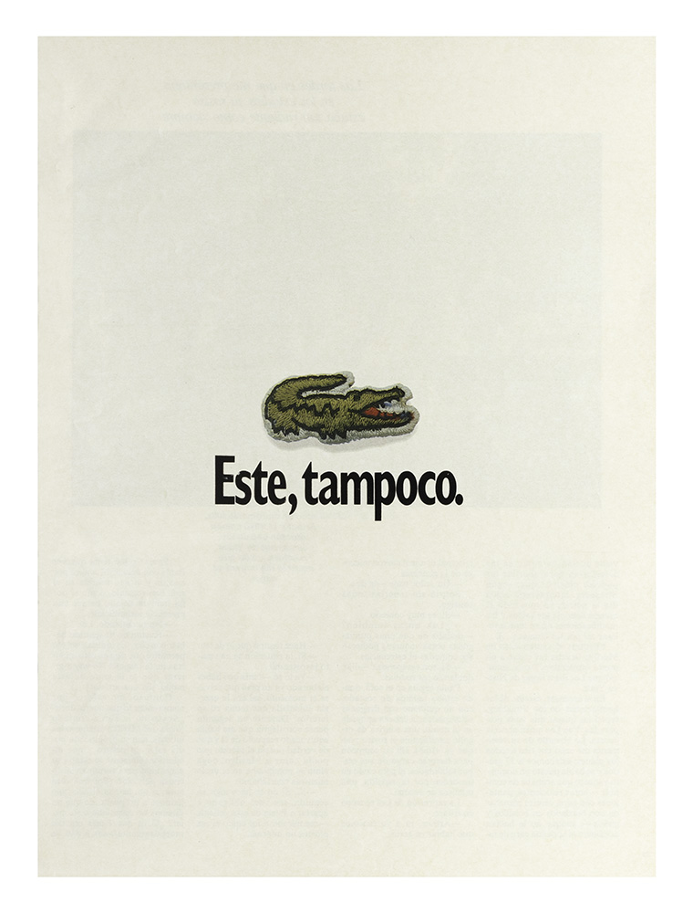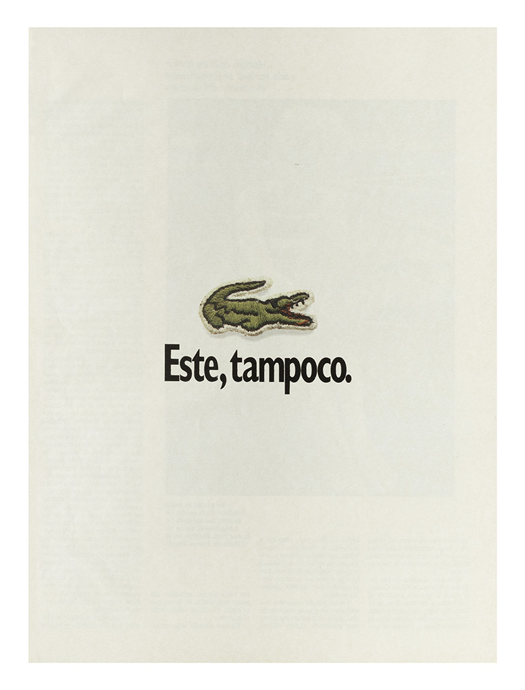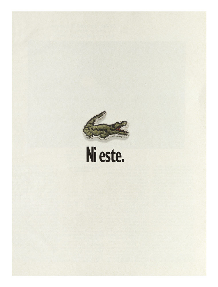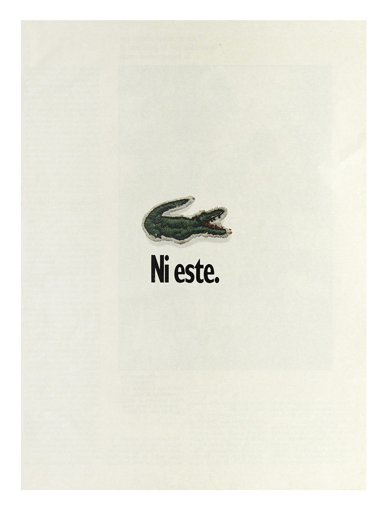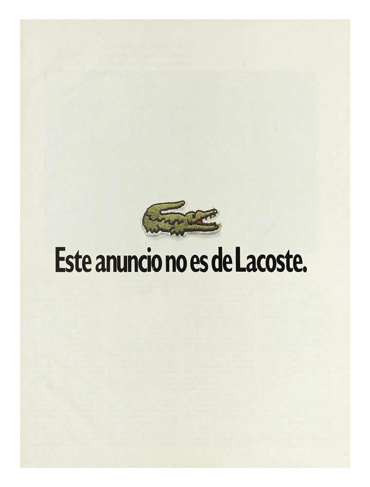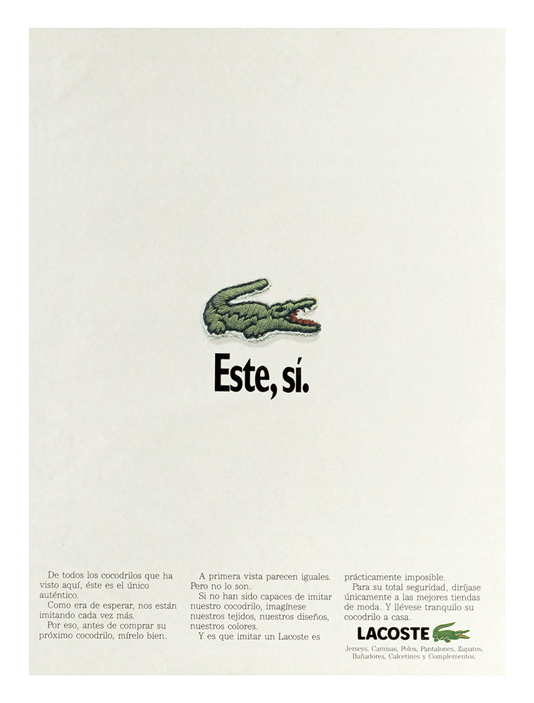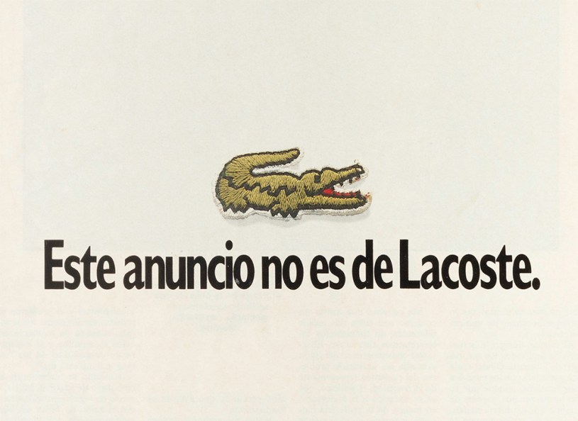Un conocido recurso creativo consiste en transformar las desventajas o los defectos, en virtudes. Así, en esta publicidad de los años 80, se utilizaron las muchas falsificaciones del logotipo de Lacoste, tratando de demostrar que en las marcas también se aplica la ley de la selección natural y sólo sobreviven las mejores.