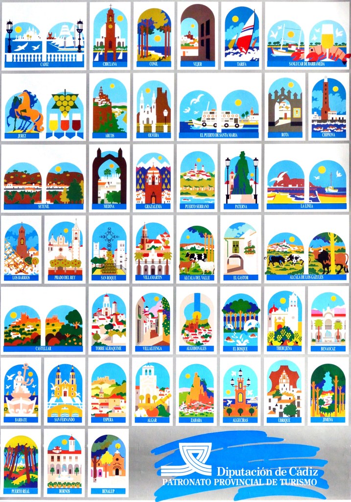 Los viajeros que circulaban a finales del siglo XX por las carreteras gaditanas, encontraban en las entradas de pueblos y ciudades estas señales turísticas que, con formas y colores sencillos, trataban de condensar los encantos de cada población. Poco a poco fueron desapareciendo del paisaje estos optimistas carteles de bienvenida que, aunque tuvieran como función principal la de incitar a los turistas a hacer una parada en su viaje, sirven al recuerdo como alegres símbolos de un tiempo pasado.